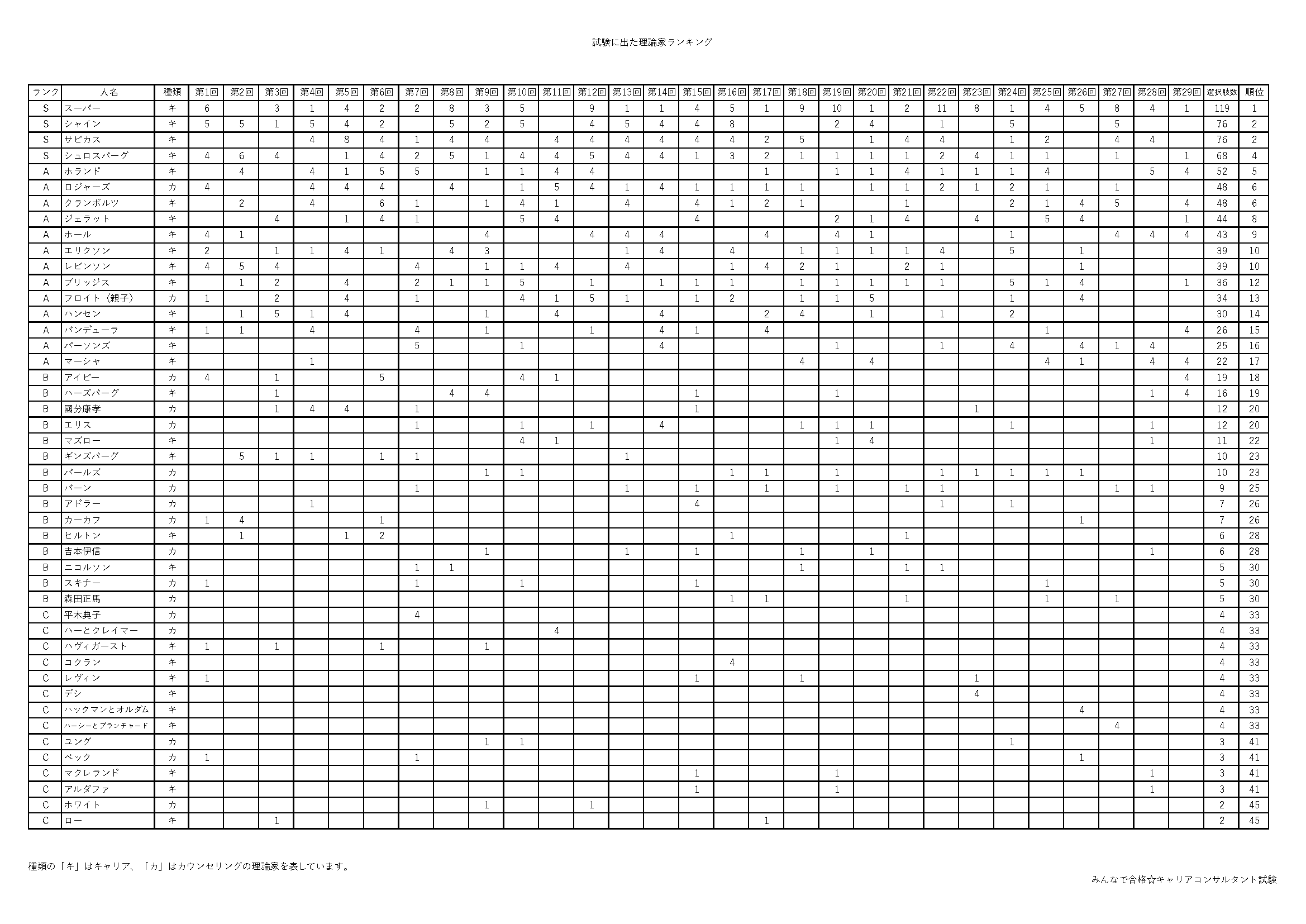 そこで、理論家(理論)対策にメリハリをつけるため、これまでの全29回の国家試験(キャリアコンサルタント試験)に出題されている、キャリア理論家とカウンセリング理論(療法)の理論家に関する出題選択肢数を集計し、ランキング形式でどの理論家がよく出題されているのかをお伝えします。