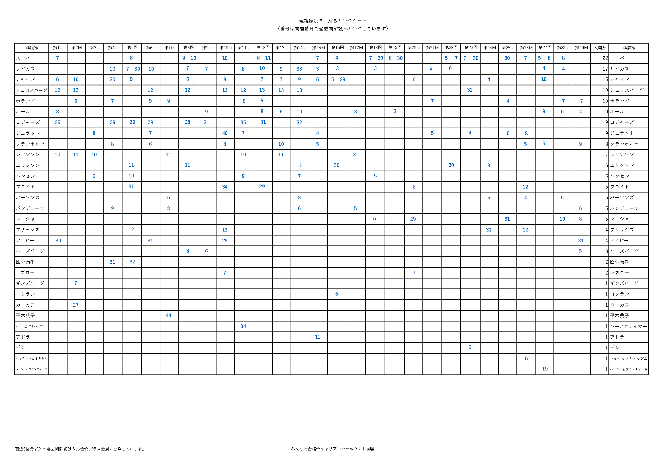 「スーパーについて…適切なものはどれか。」といった大問(選択肢4つ分)での出題については、これまでの過去問解説へのリンクを一覧にした、「理論家別ヨコ解きシート」を用意しています。