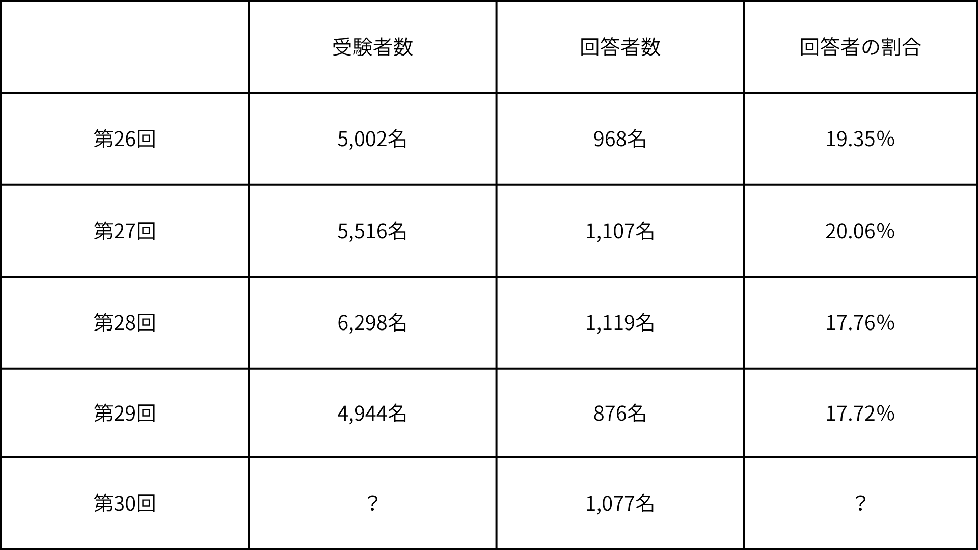 回答者数の割合が全体の約2割と仮定すると、今回の受験者数は、5,300~5,500人程度で、受験者数は前回よりも増加している可能性があります。