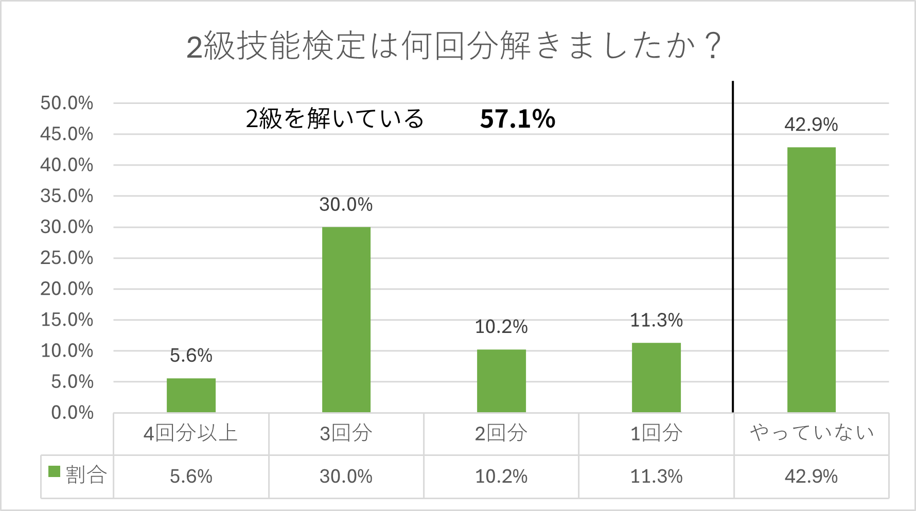 まず、全体では2級技能検定を1回分でも実施した人の割合は57.1%で、「やっていない」人は42.9%でした。
