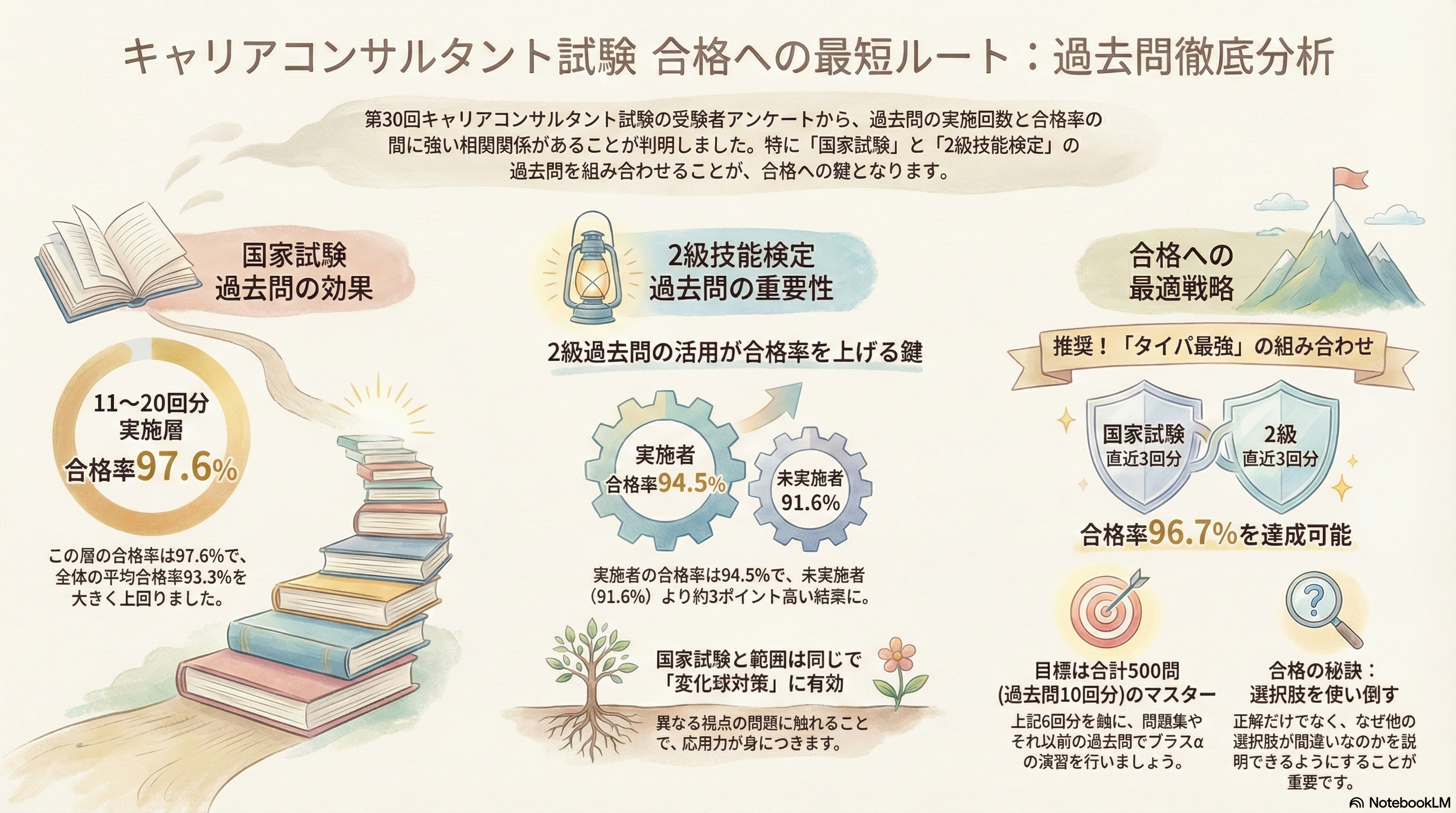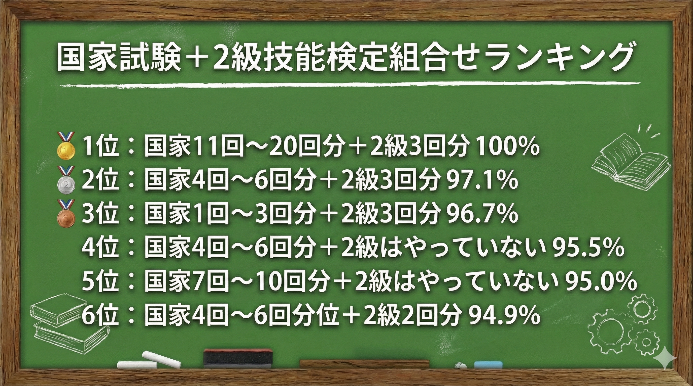 最も合格率が高いのは「国家11~20回分」に「2級3回分」を加えた組合せです。