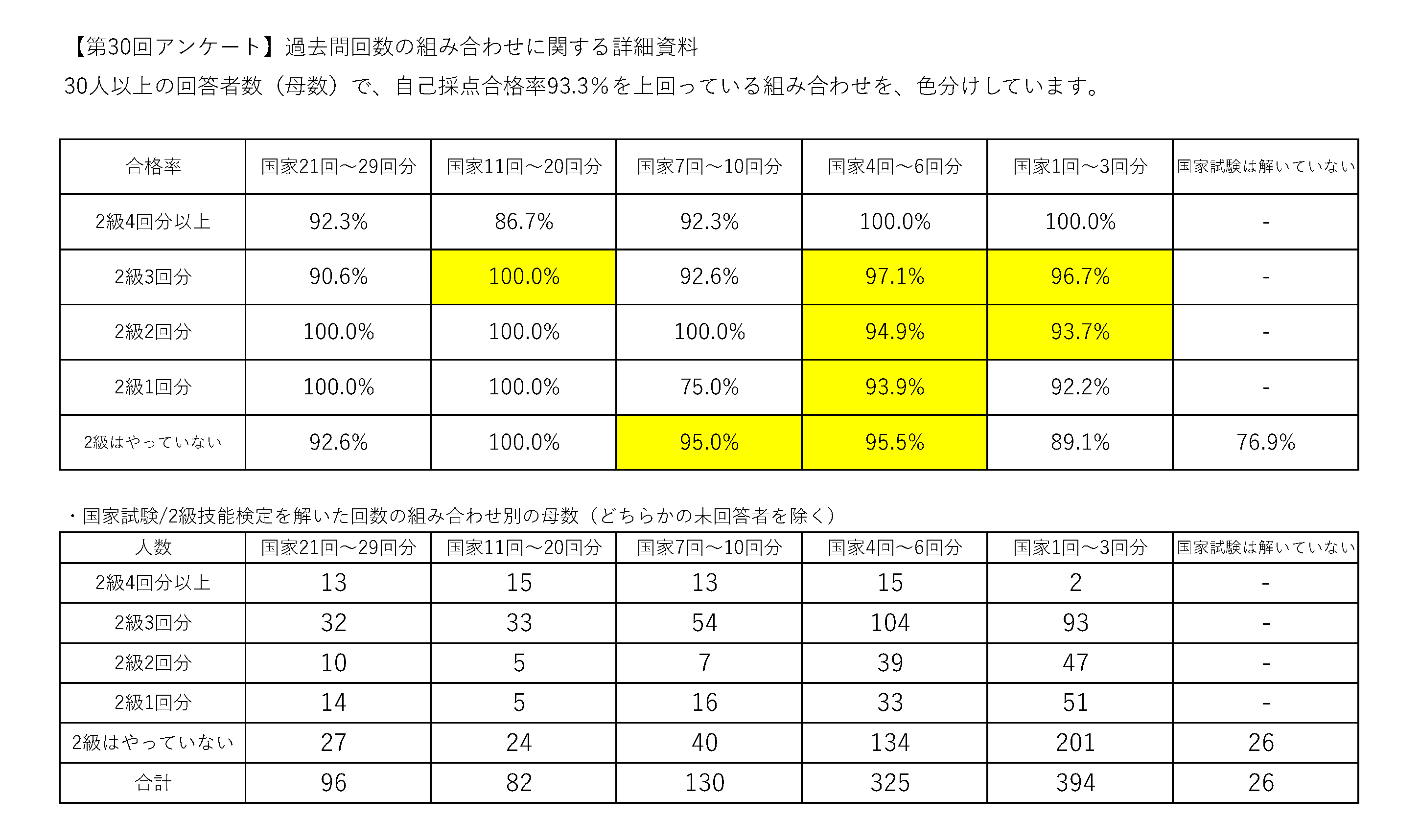 なお、すべての組合せによる人数(母数)と合格率の関係は次の資料で明らかにしています。 なお、網掛けになっている箇所は、母数が30人以上の回答者数で、自己採点合格率93.3%を上回っている組合せを意味しています。