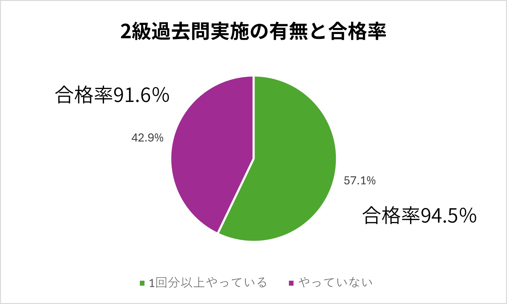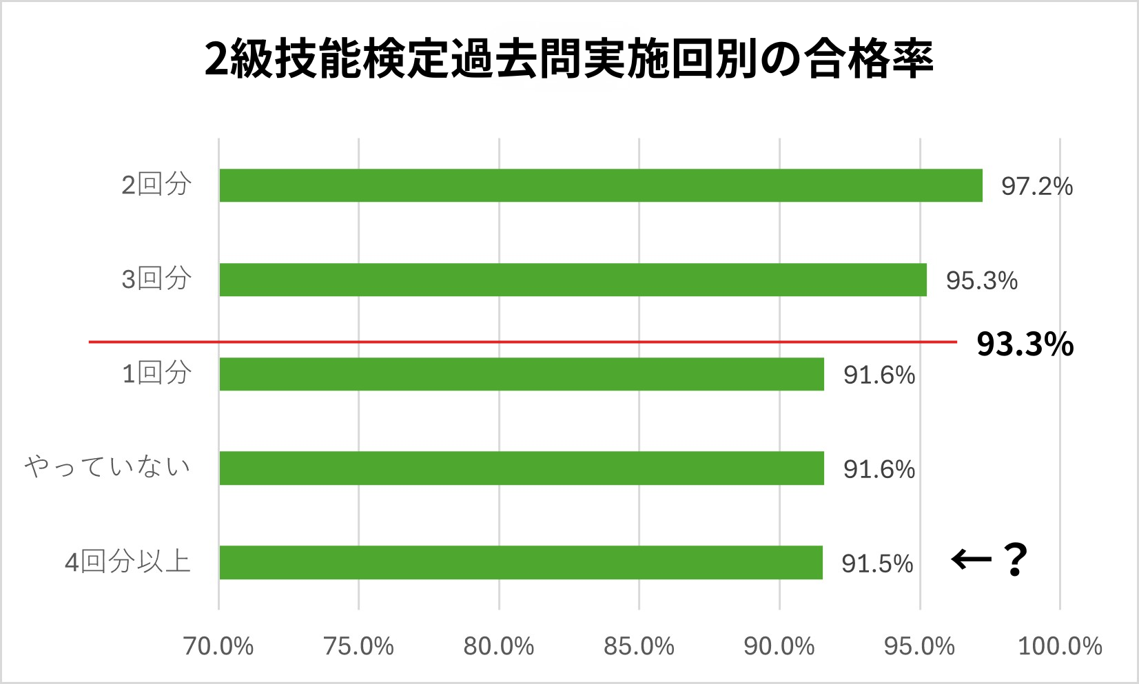 「4回分以上」の合格率が低いのは母数が少ない点が影響しており、やや不思議な結果でしたが、「1回分」「やっていない」「4回分以上」が93.3%を下回っています。