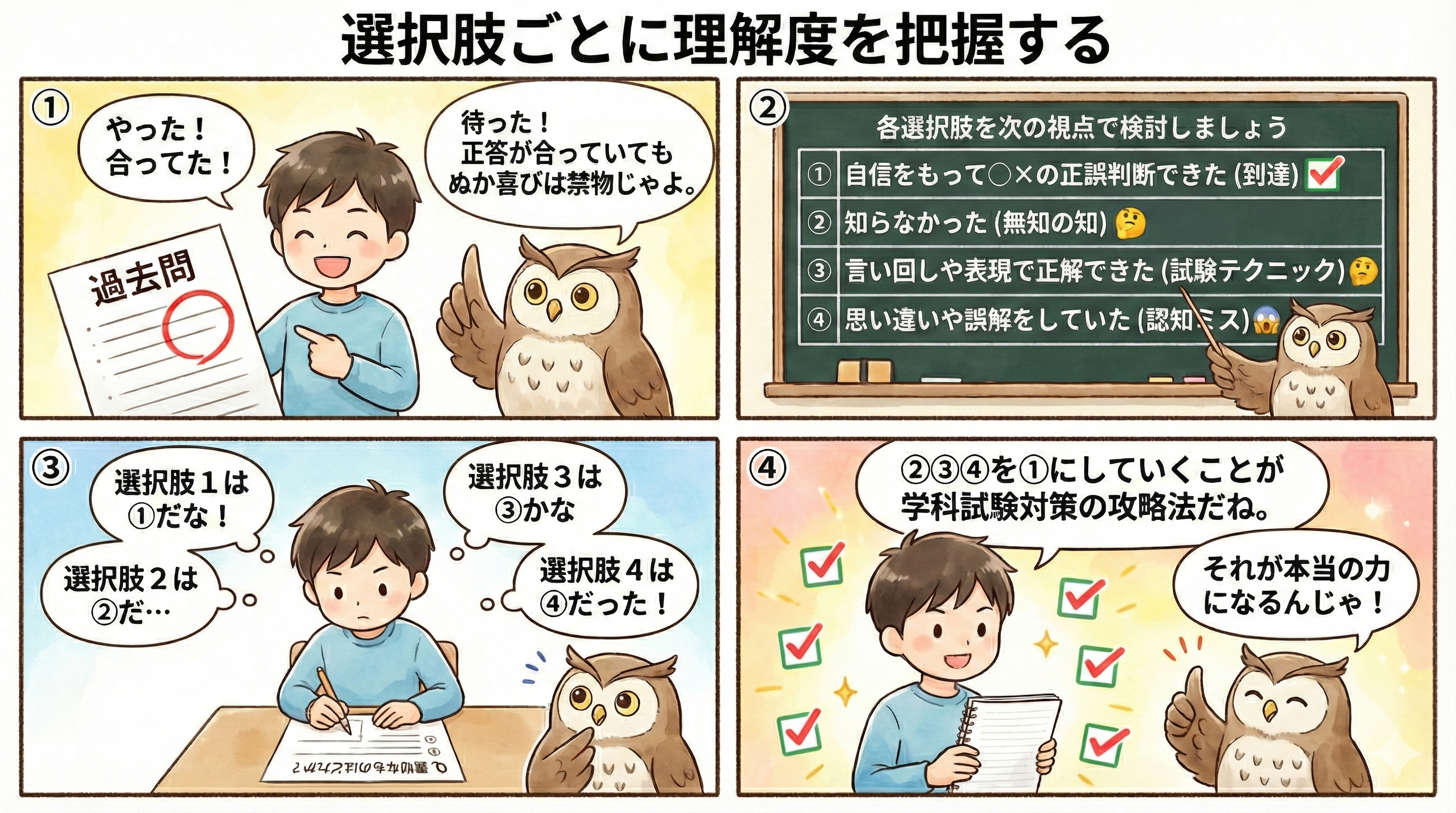 最後に、特にお伝えしたいことがあります。過去問などを解く際には、正答が出せたらヨシではなく、正答以外の各選択肢の内容もよく確認をしましょう。