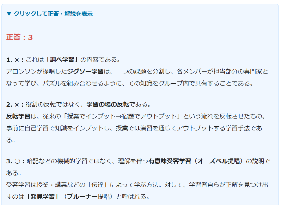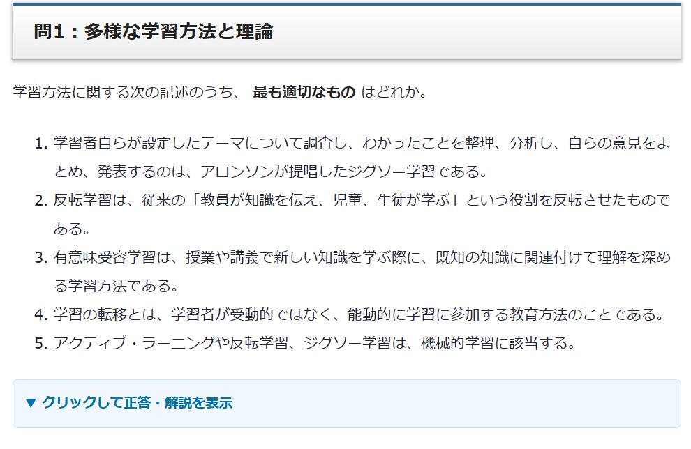 問題では上記のまとめの内容を網羅的に確認できます。また、今回初めての試みとして、「正答と解説」をクリックして表示する機能をサイトに搭載しました。