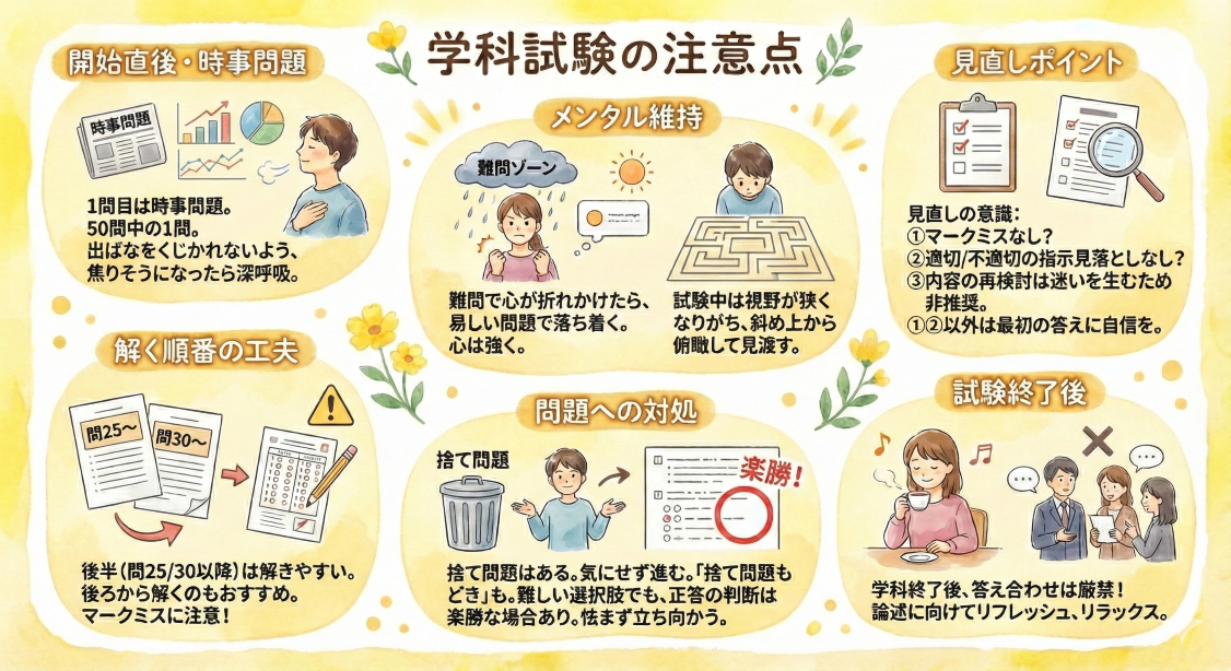 ・学科試験が終わりましたら、答え合わせは厳禁です。論述試験に向けて、リフレッシュ、リラックスしましょう。