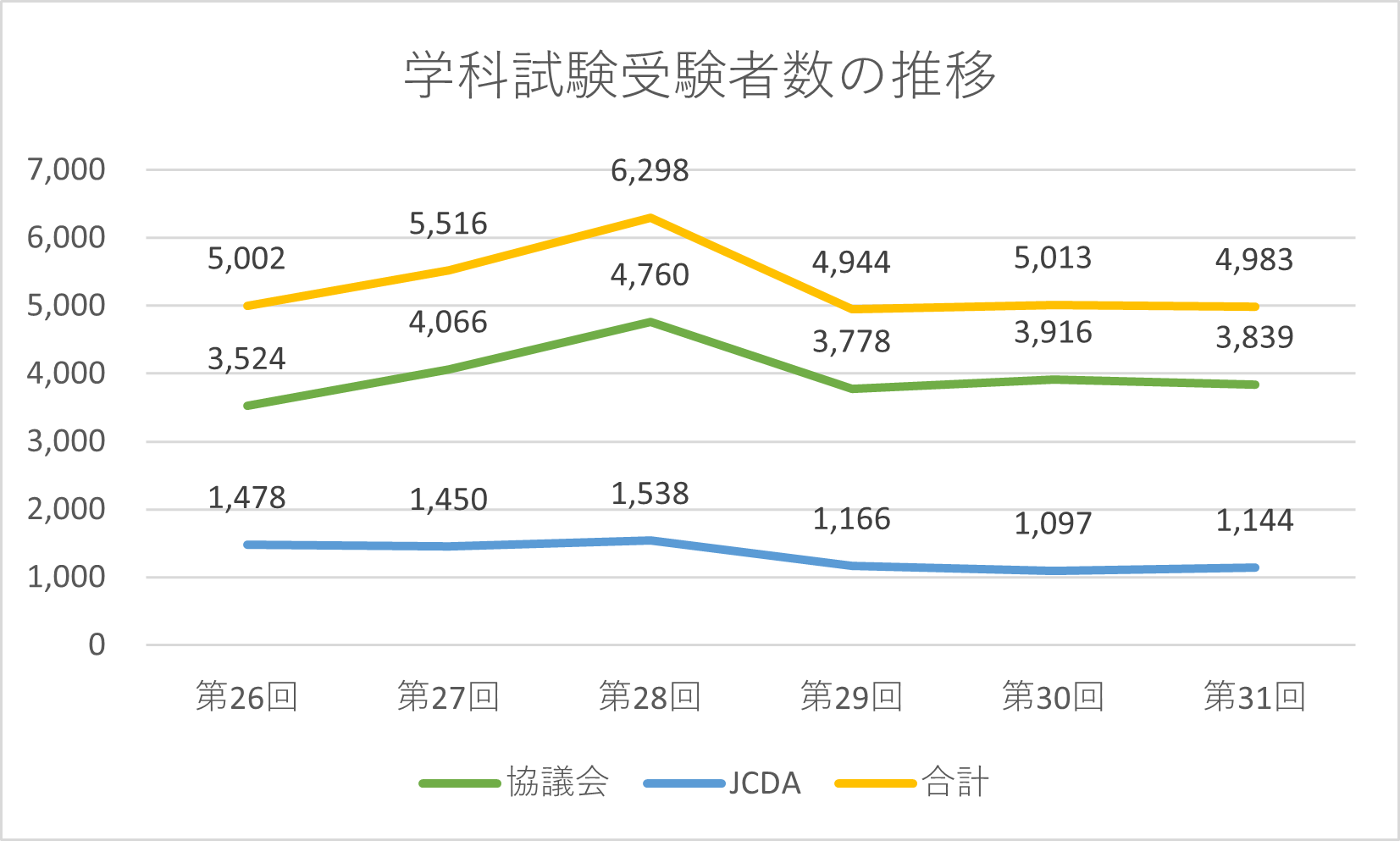 実技試験の合格率は協議会63.8%(前回63.0%)、JCDA67.8%(前回68.2%)で協議会は0.8ポイント増加、JCDAは0.4ポイント低下しました。