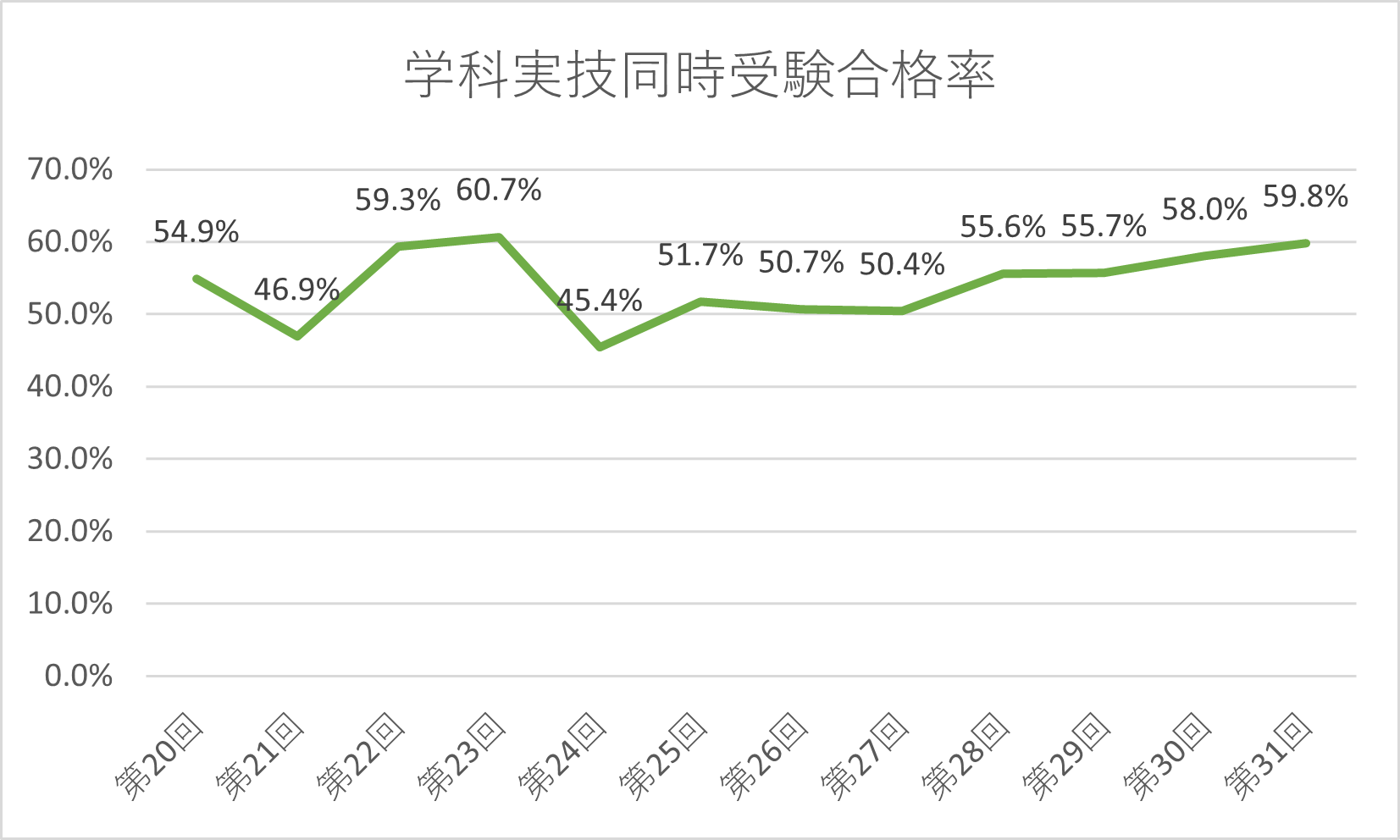 50%を下回る回は、同時合格率が厳しい回であると位置づけていますが、今回はどちらもそれを大きく上回っています。