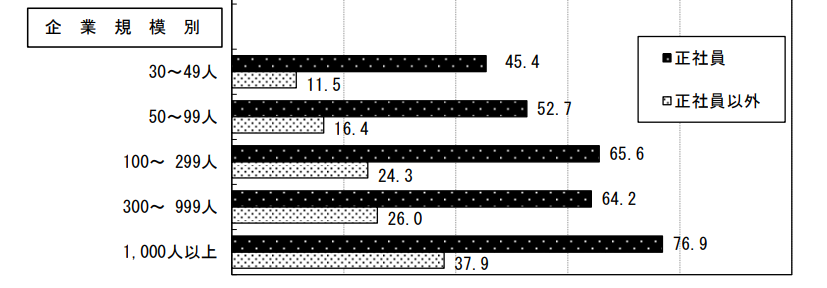 2.○:計画的なOJTは、正社員、正社員以外ともに、おおむね規模が大きくなるほど実施率は高くなる傾向がある。【P21】