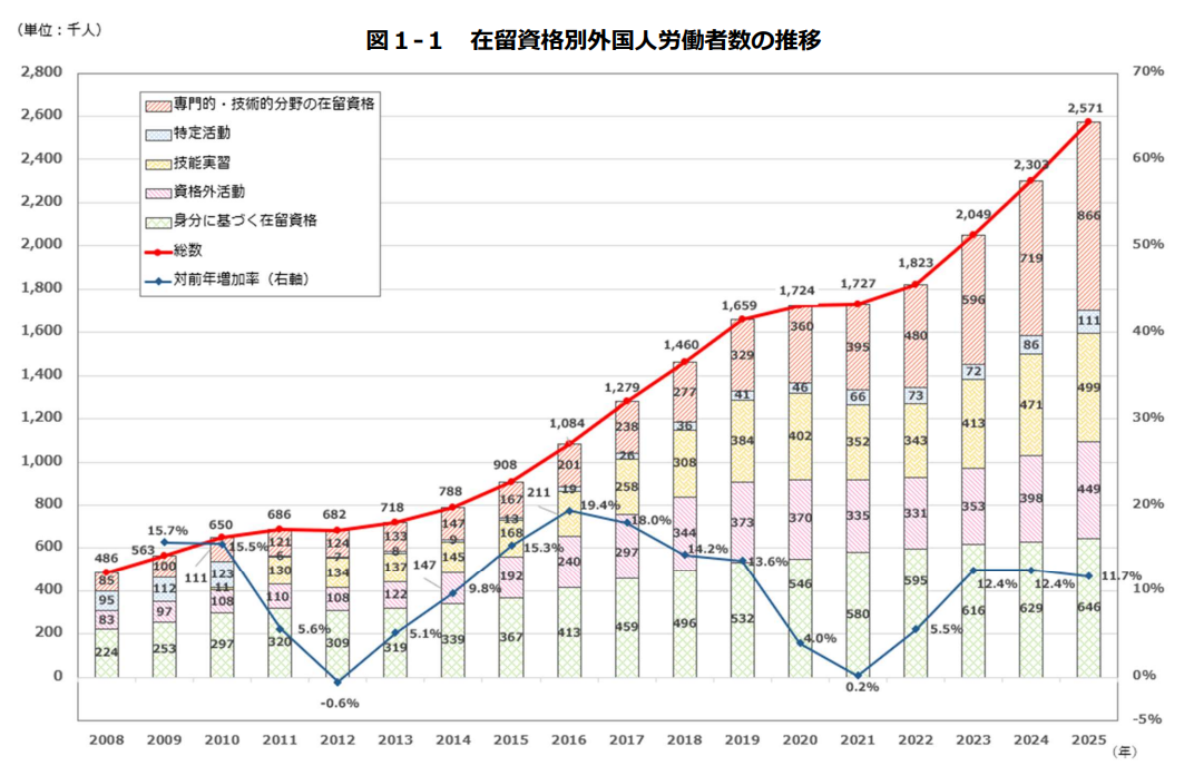 令和7年10月末時点での外国人労働者数は約257万人で、前年比11.7%増加し、届出が義務化されて以降、過去最多を更新している。【P3】
