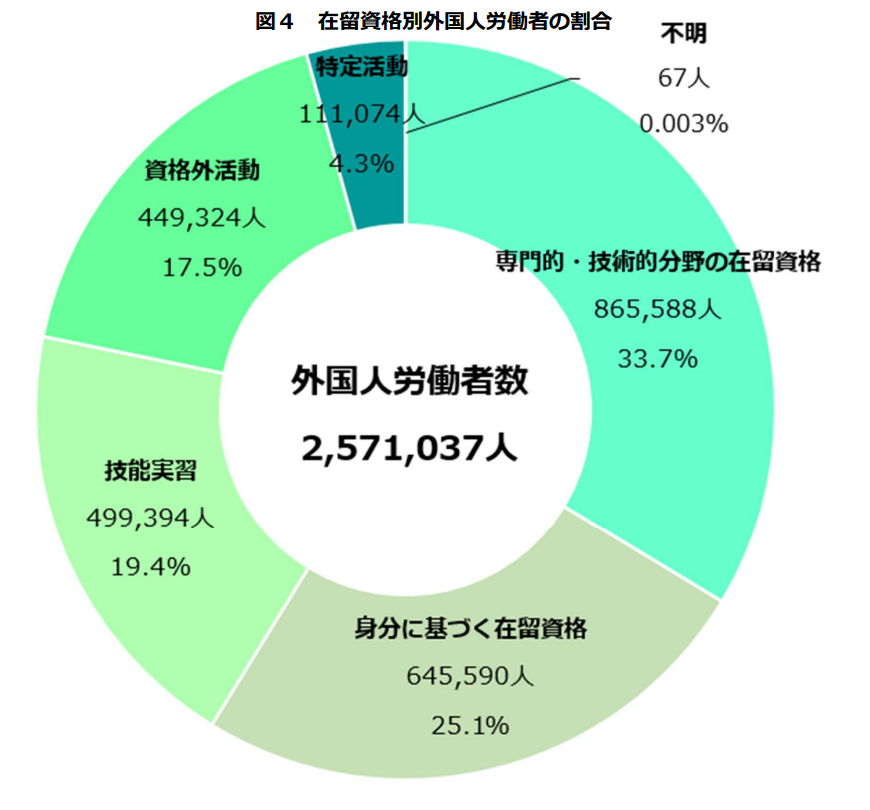 2.外国人労働者を在留資格別にみると、「身分に基づく在留資格」が最も多い。