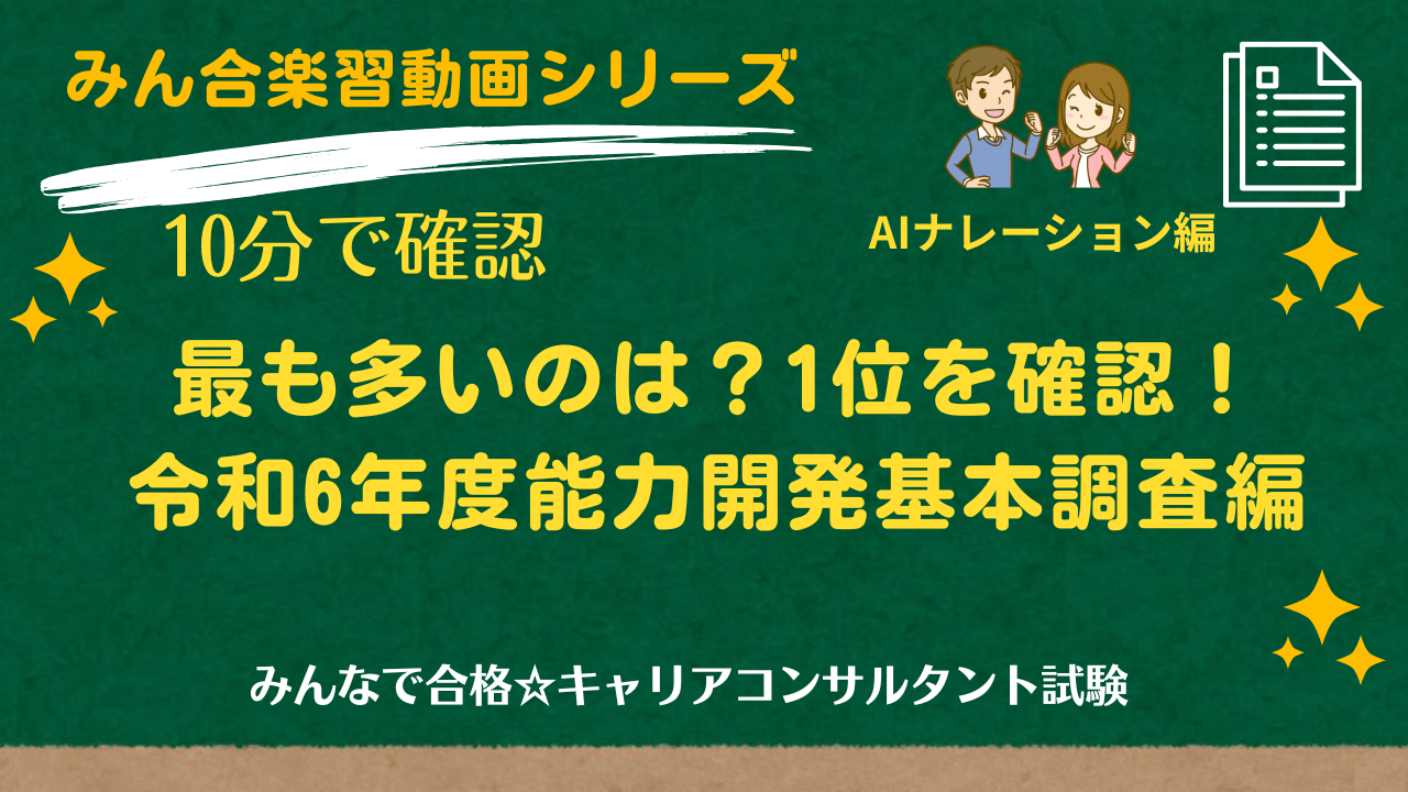 ≪会員限定≫試験に頻出の能力開発基本調査では、調査結果の「最も多いのは?」が問われることが多いため、1位だけを集めた記事と動画を制作しました。きっと、得点に直結します。