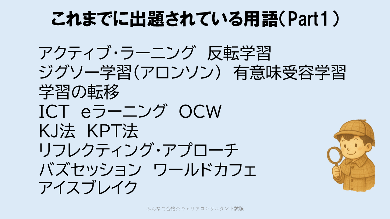 一方で、(1)教育指導の内容は詳細な知識、理解が問われることが多く、また、キャリアコンサルタントにとっては学ぶ機会が少ないと感じる内容が多いため、これまでの出題内容を分析し、ポイントをまとめます。