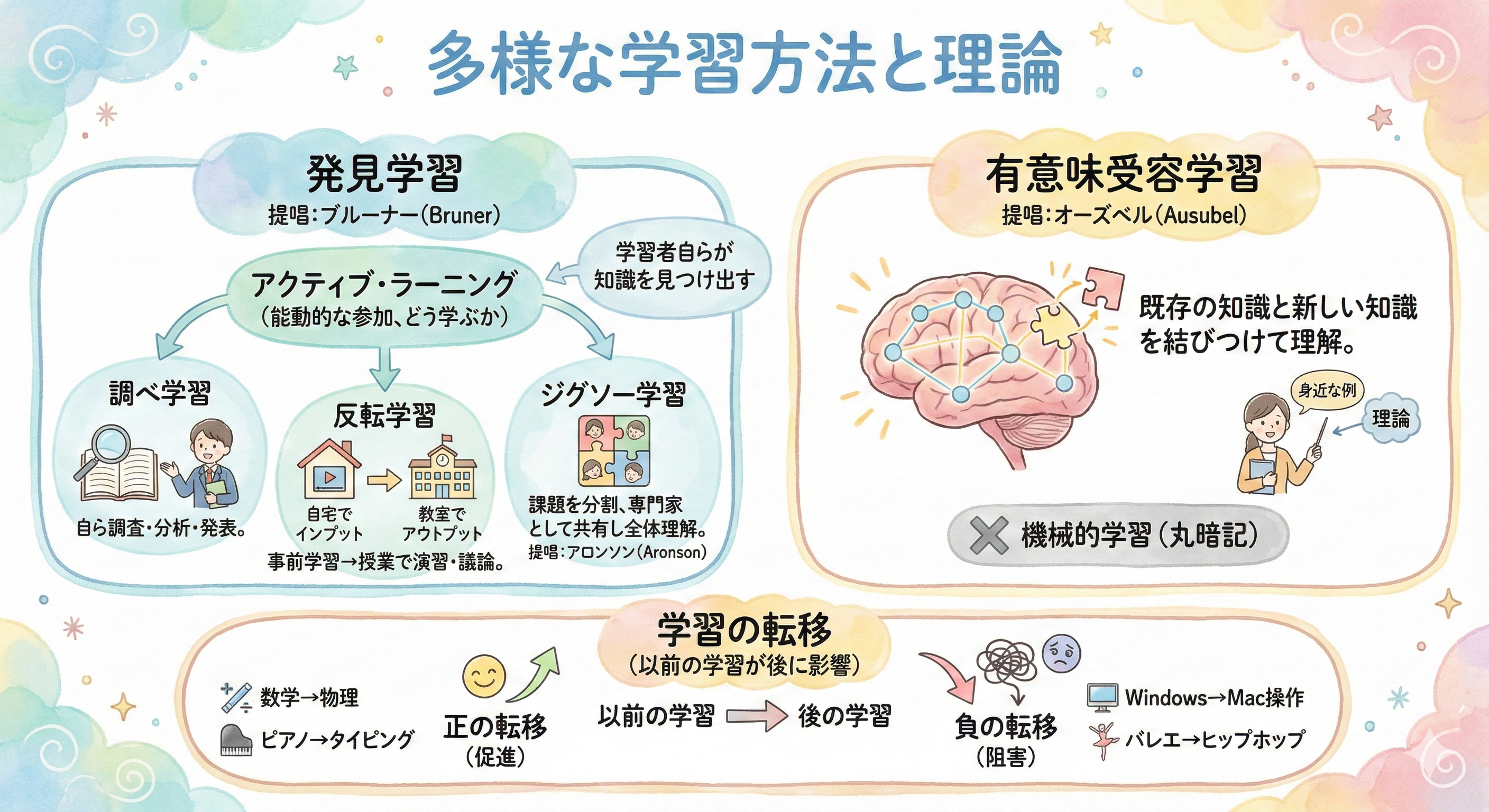 アクティブ・ラーニング、調べ学習、反転学習、ジグソー学習は、教員が答えを教えるのではなく、学習者自らが正解や知識を見つけ出す学習方法であり、アメリカの心理学者ブルーナーが提唱した「発見学習」の理論を背景としている。