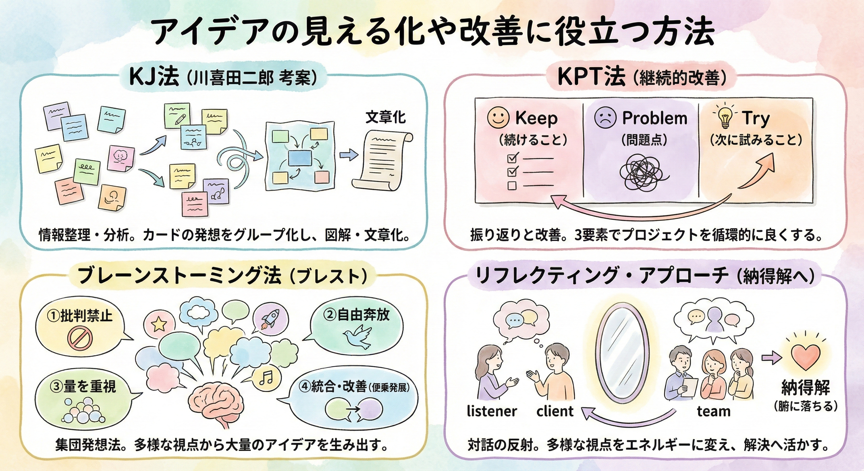 Keep(続けること)、Problem(問題点)、Try(次に試みること)の3つの要素からプロジェクトや業務の内容を振り返り、継続的な改善を図る方法である。
