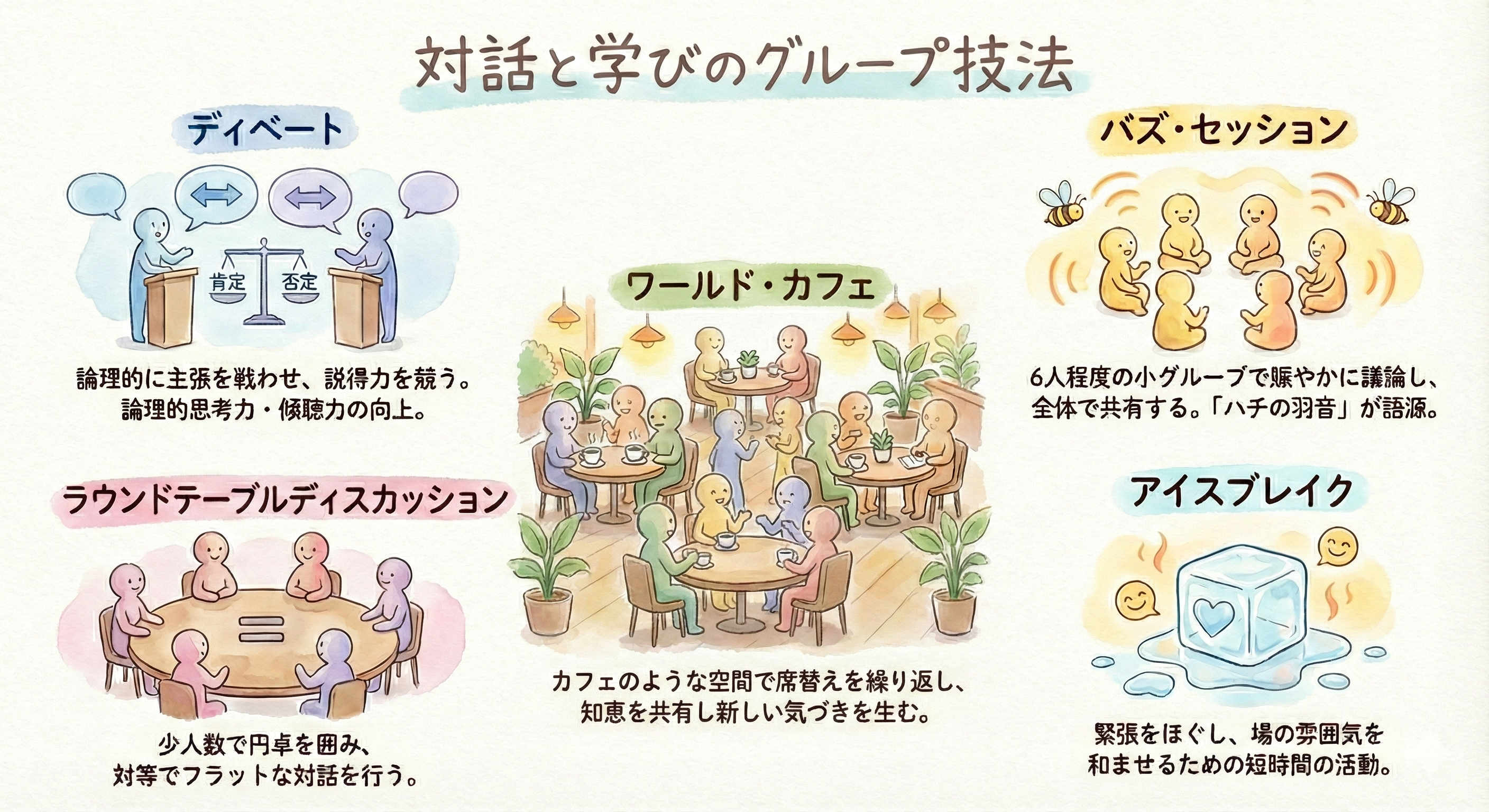 具体的には、調べ学習、反復学習、ジグソー学習、ディベートなどがある。学ぶ人自身が課題を発見し、解決する力を身につけることを目的としている。