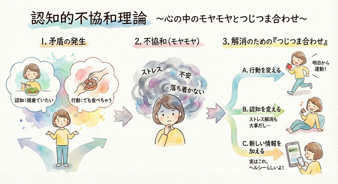 不協和状態を解消する方法には、行動を変えることや、認知を変えること、新しい情報を加えることがある。