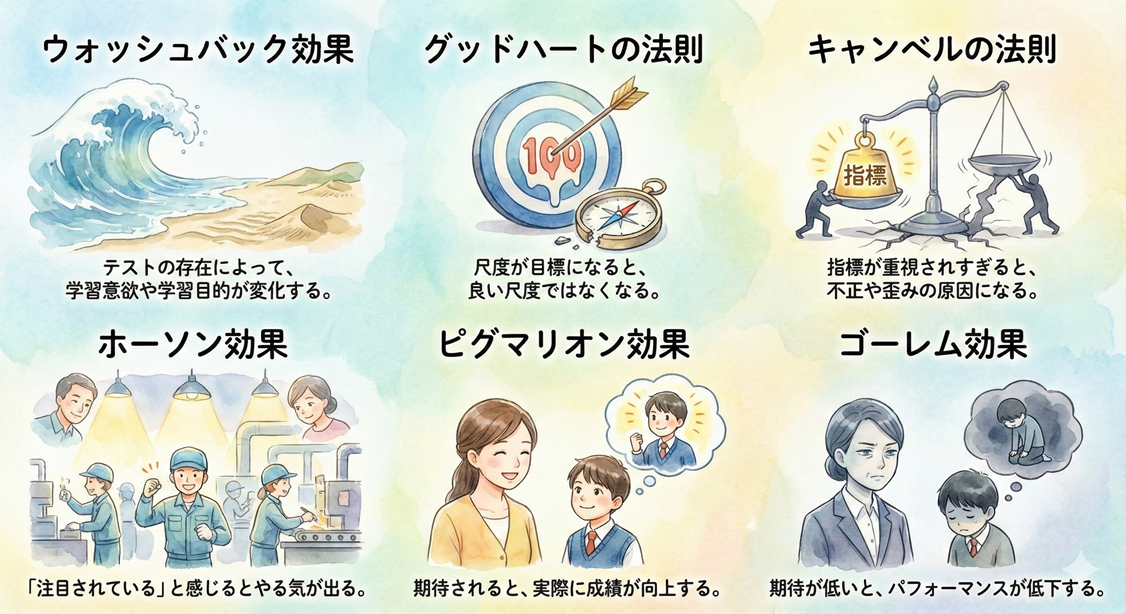 テストという明確な目標ができることで学習意欲が高まるポジティブ・ウォッシュバックと、テストの点数を取ることが目的化し、テストに出る範囲しか勉強しないなど、本来の学習目的が歪められるネガティブ・ウォッシュバックがある。