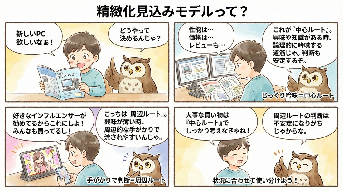 精緻化見込みモデルは、説得を受けた際の情報処理(思考)の道筋を、受け手の状態によって、中心ルートと周辺ルートの2つに分類する理論である。